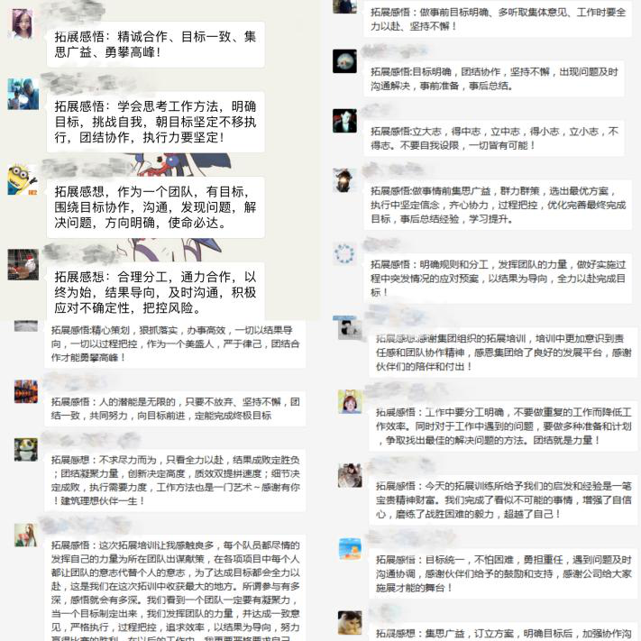 各項挑戰過后,大家都積極進行分享總結,討論個人與小組的成敗原因,通過游戲反思工作與生活;付出有多少,收獲便會有多少,在日后的工作中,以結果為導向,為了目標找方法,不找借口,發揮團隊的力量,凝心聚力,決戰未來!