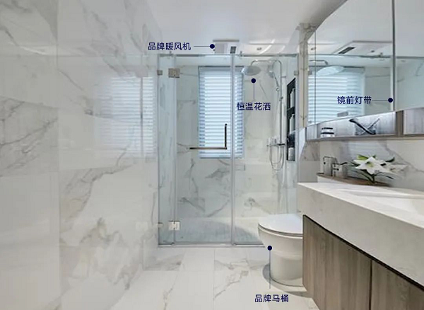 衛(wèi)浴中選用品牌暖風機,集取暖、換氣、照明、吹風于一體,通過特有送風技術,以實現(xiàn)全方位的高效速暖,覆蓋范圍更全面,均衡維持浴室理想溫度,使業(yè)主盡享如沐春風的溫暖。